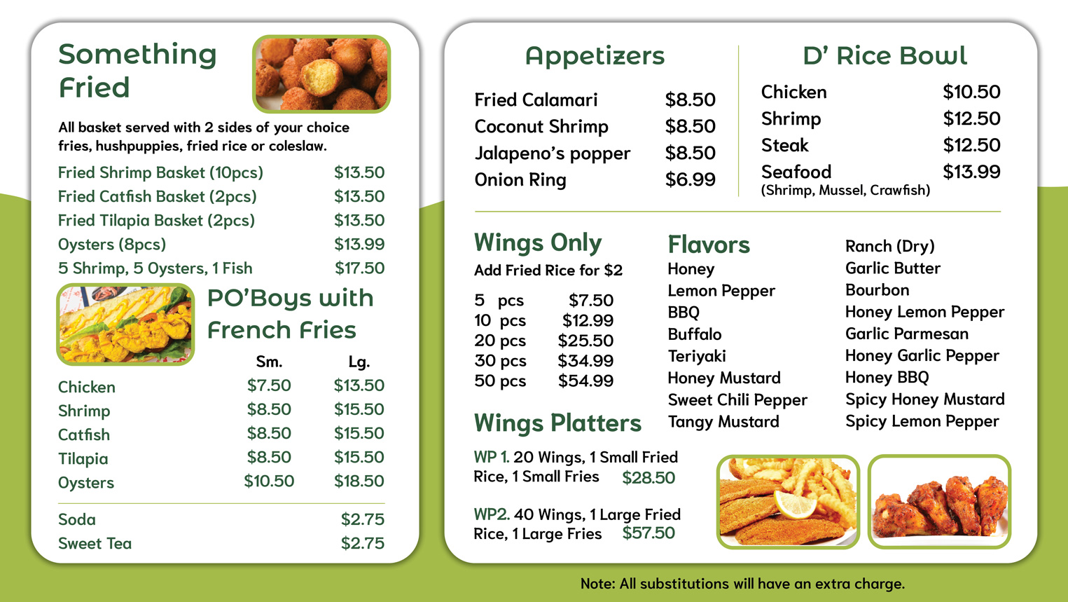 something for you! Our Cajun style wings and ribs with French fries are gorgeous!